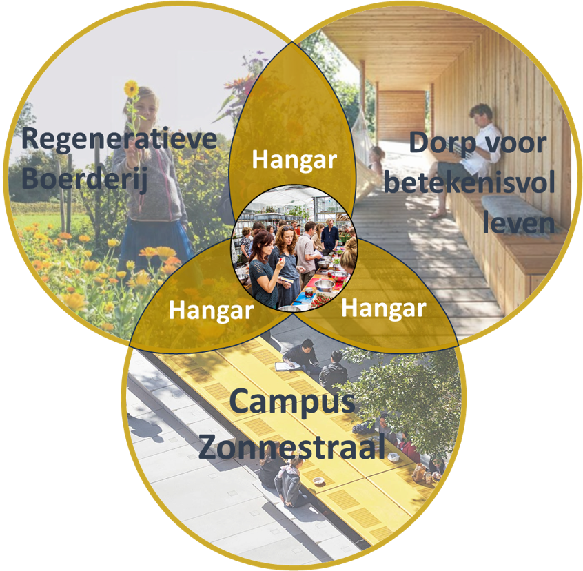 De Hangar is een gezamenlijk projectvan de betrokken partijen in de campus Zonnestraal, de woon-werkgemeenschap en de regeneratieve boerderij op het landgoed.