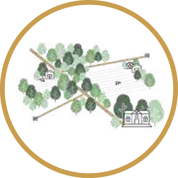 Het herstel beperkt zich niet tot het hart van het landgoed, maar strekt zich uit tot de Kleine Eng en Grote Eng langs de Rading. Hier komen kleinschalige, natuurvriendelijke akkers, graslandjes en fruitgaarden. De huidige, harde grens tussen het bos en de enggronden wordt omgevormd tot een soortenrijke overgangszone met kruiden, planten, struiken en voedseldragende bomen. Het boerenpad langs deze ‘zoom’ verbindt de woongemeenschappen rond de Kleine Eng met de campus. Halverwege ligt de betonnen plaat van de Fliegerhorst. De hangar die hier ooit stond komt terug, maar dan als warme, uitnodigende ontmoetingsplek voor bewoners, ondernemers en bezoekers van het landgoed.